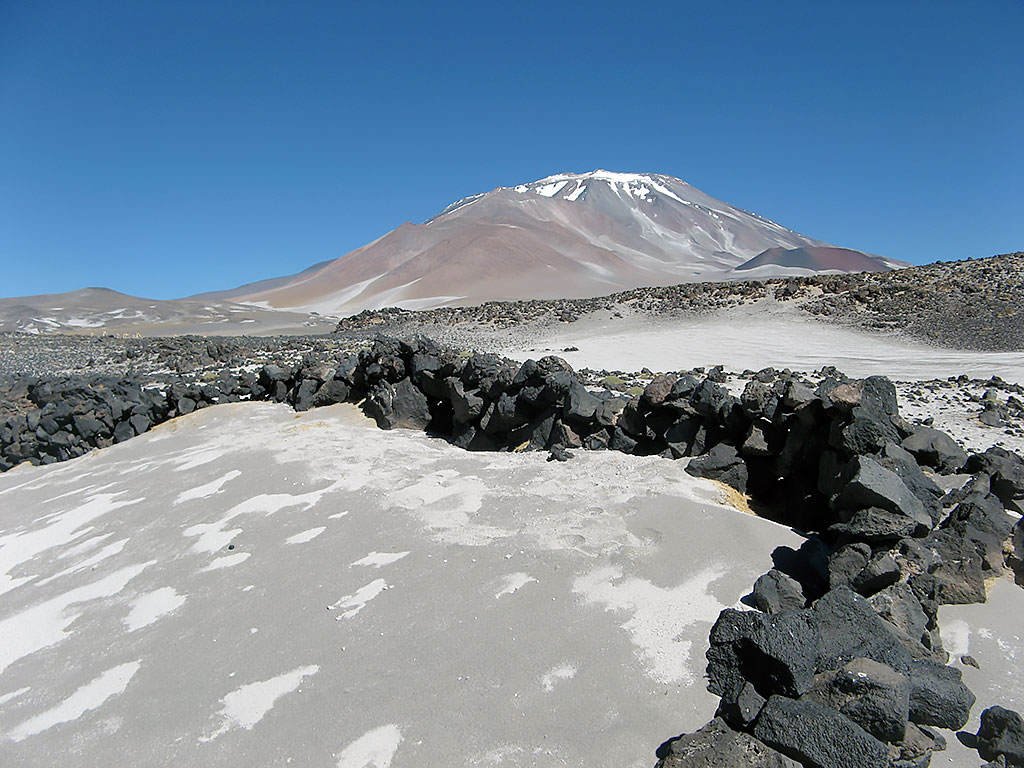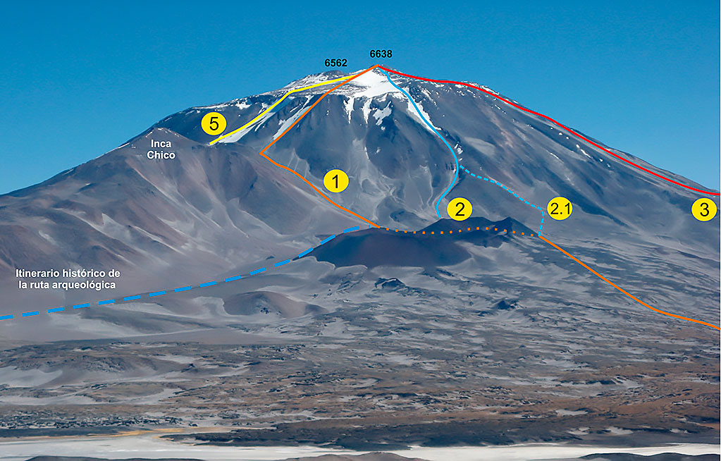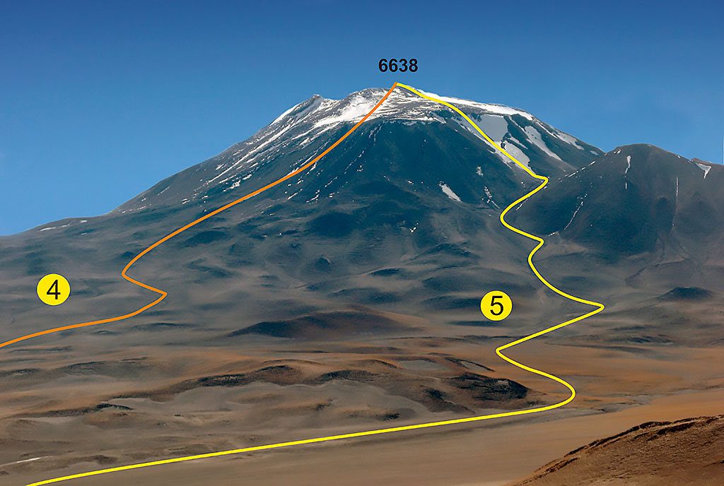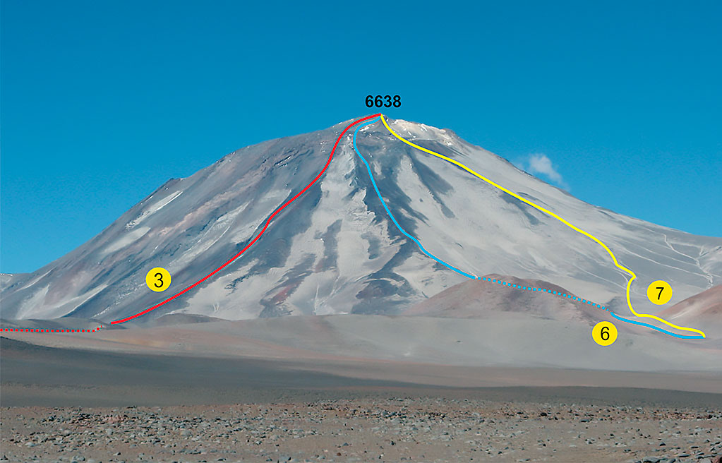Descripción: Se sigue la Ruta Del Col (1) hasta el vasto plano arenoso ubicado entre los volcancitos Gemelos y el cono principal. Allí se tuerce al SO, tomando un planchón de pedrero rojizo que conduce hasta una empinada quebrada, en la cual se asienta más arriba y se continúa según la temporada por firme acarreo o nieve. Junto al pie del nevero Noreste se instala el campamento Balcón (27°01’14”S / 68°16’52”O, 5.800 m). Al otro día, se recorre el nevero, que puede aparecer discontinuo y con tramos de hasta 40°, hasta alcanzar el plateau cumbrero, el cual se transita con dirección SO hasta alcanzar la cumbre Principal. Desnivel: 838 m. Distancia recorrida: 2,4 Km. Tiempo de actividad: 6 a 7 hs.