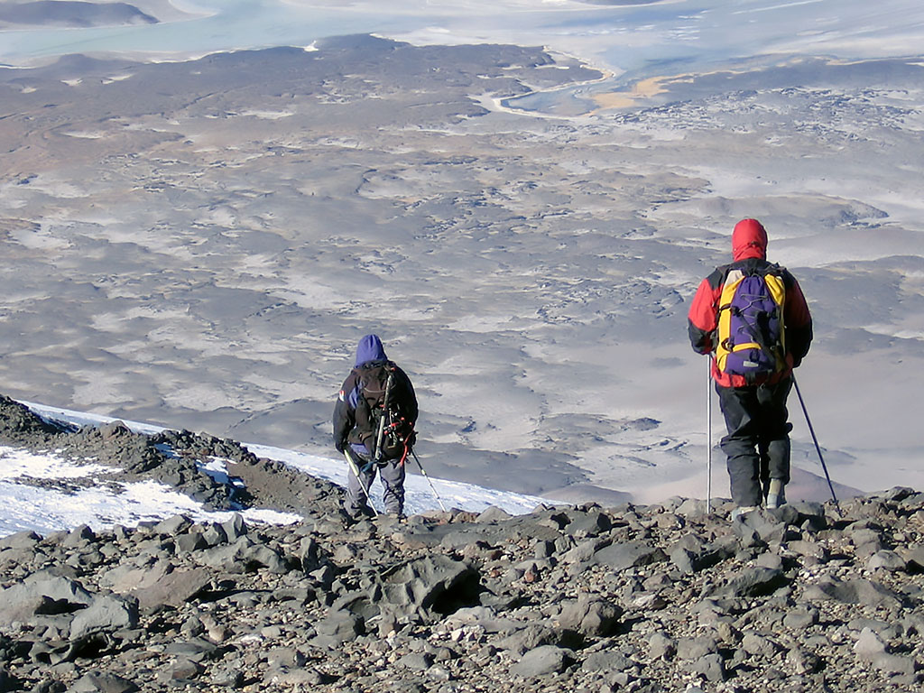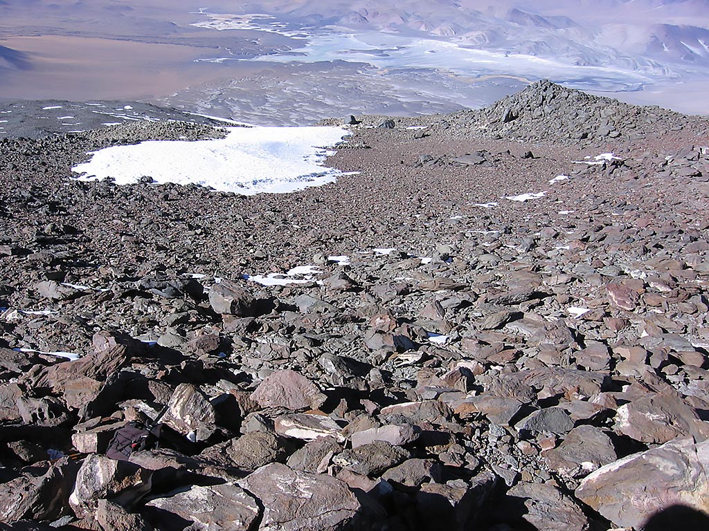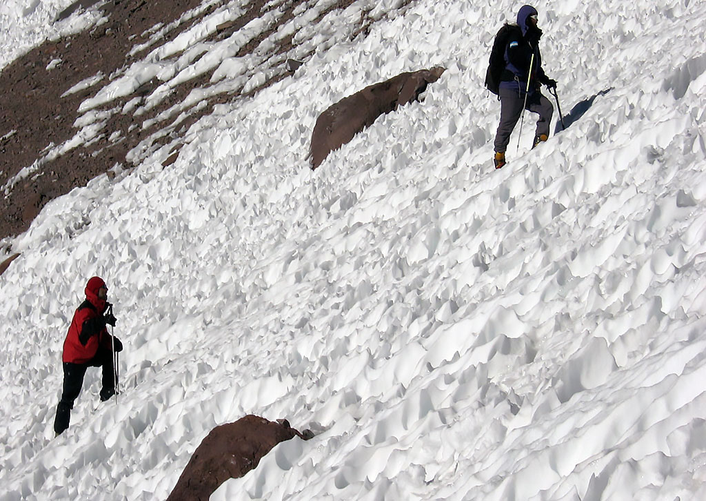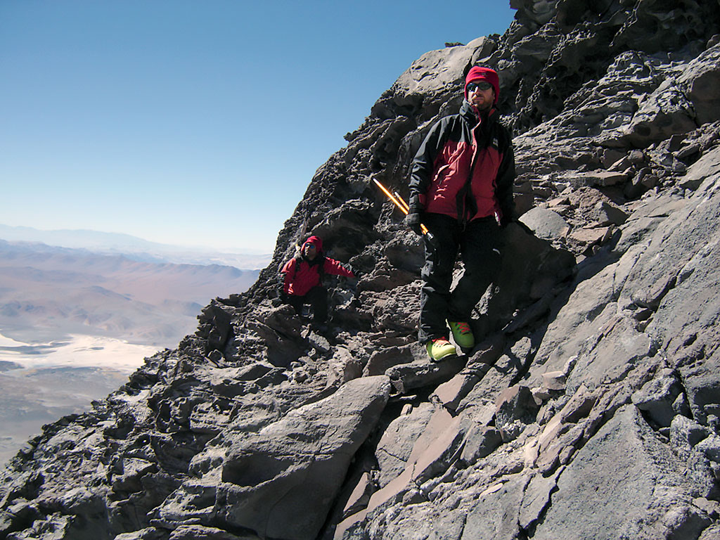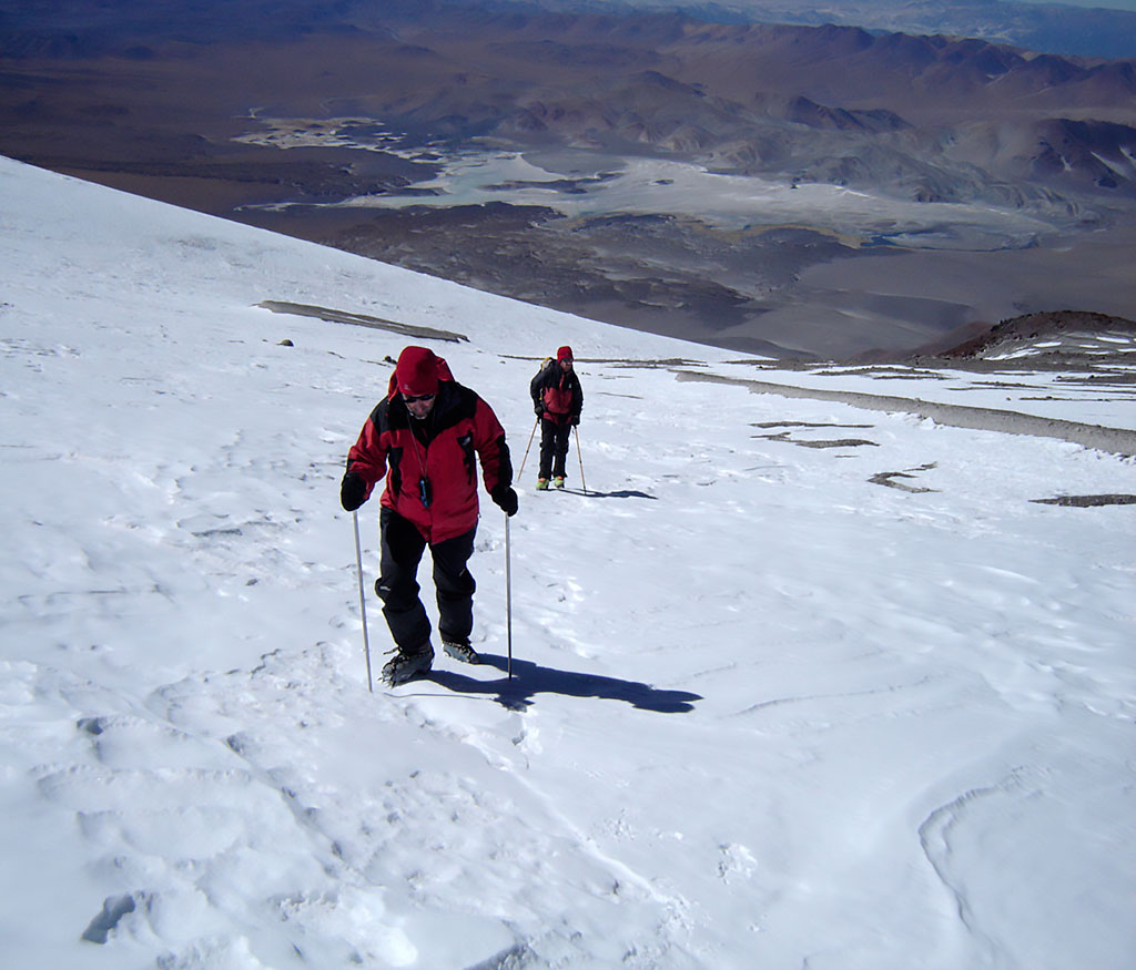El segundo día, se asciende por el empinado nevero este tratando de evitar los penitentes si los hubiera. En la parte final de éste la pendiente gana gradiente (40º) y se sale por roqueríos que requieren algún paso de II grado alcanzando finalmente el plateau cumbrero (27º02’12”S 68º17’03” O, 6.300 m). Desde aquí por la sucesión de acarreos y neveros del plateau hasta llegar cerca del borde del cráter y rodeándolo hasta la cumbre.