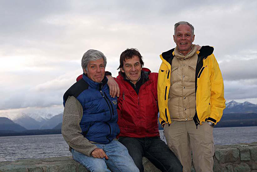 Marcos Couch, Nicolás de la Cruz y Pablo Schogl, junto al Nahuel Huapi, recordando su expedición al Himalaya en 1993.